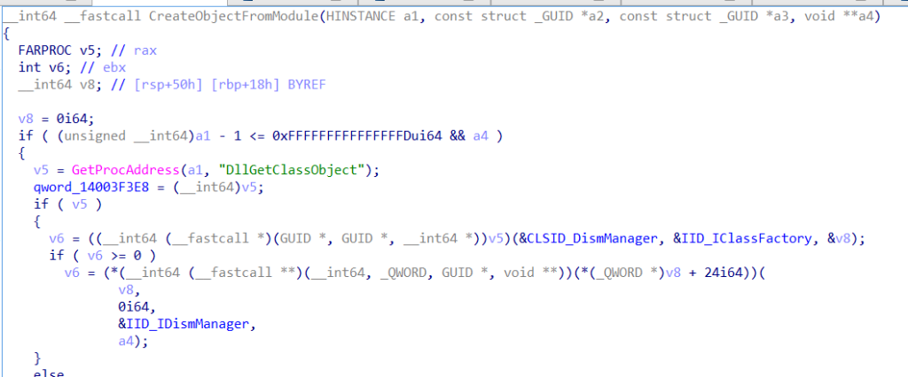 CreateObjectFromModule calls DllGetClassObject which is used by the attackers in their DismCore.dll as we see later,