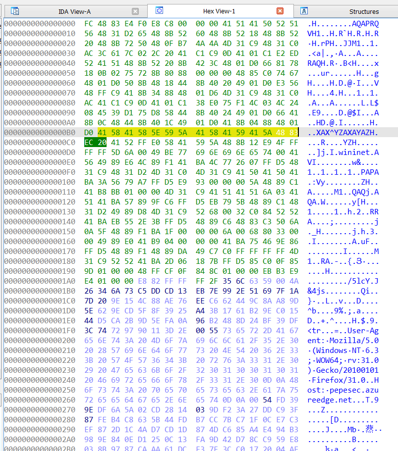 $sequence2 = { 41 59 5A 48 8B 12 E9 4F FF FF FF 5D 6A 00 49 BE 77 69 6E 69 6E 65 74 00 41}