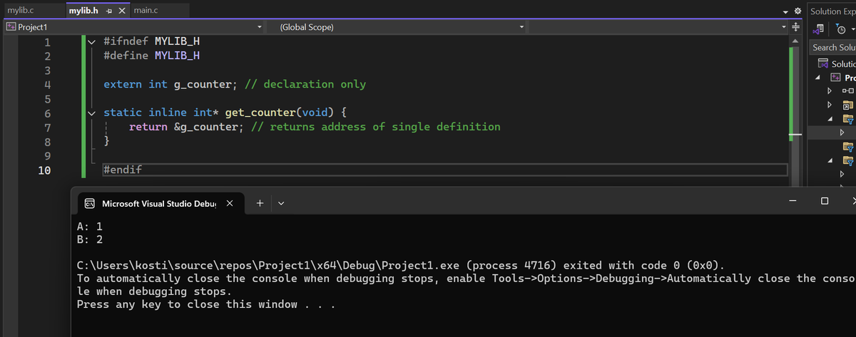 #ifndef MYLIB_H #define MYLIB_H extern int g_counter; // declaration only static inline int* get_counter(void) { return &g_counter; // returns address of single definition } #endif